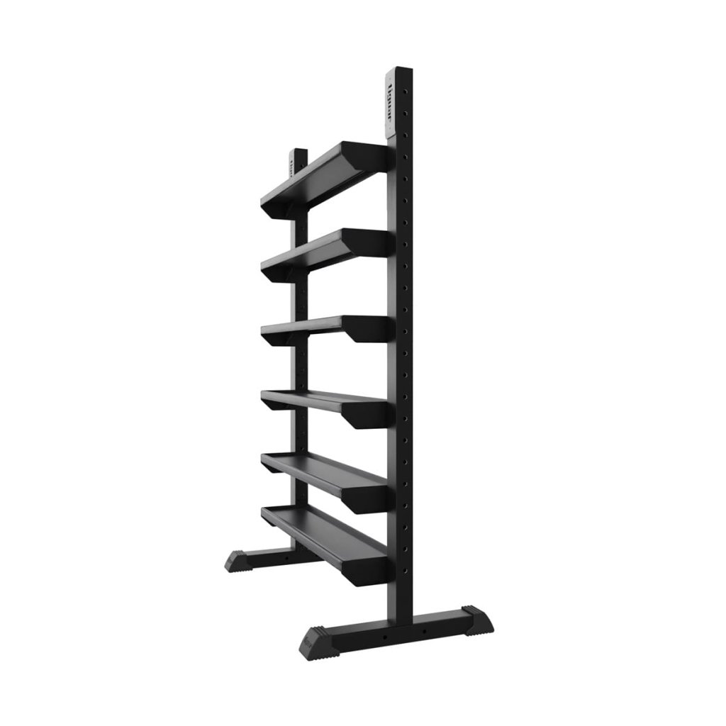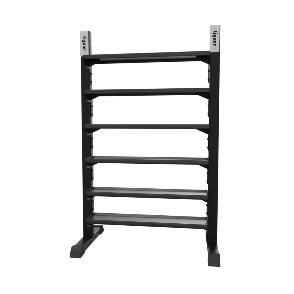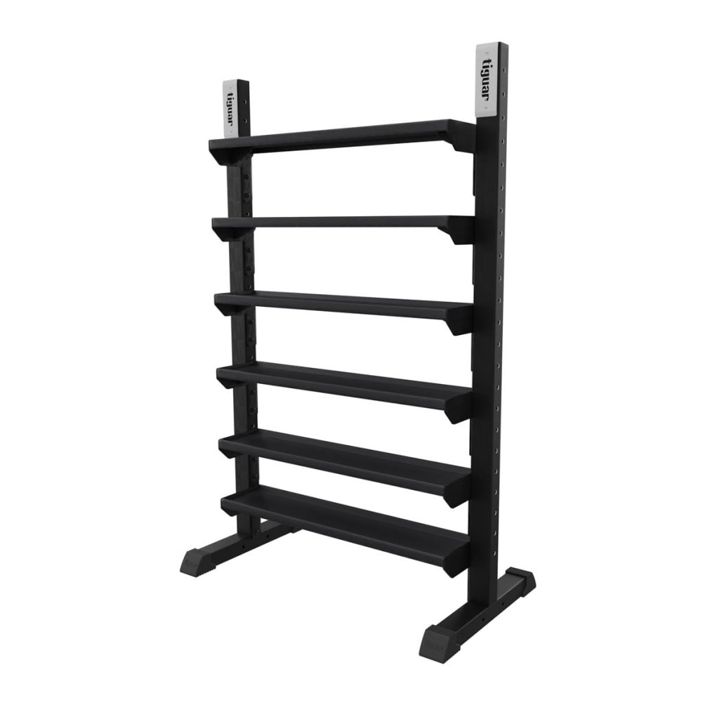 Multifunkční stojan Tiguar® se šesti policemi byl navržen pro maximální praktičnost, stabilitu a dlouhou životnost. Je vhodný pro uložení vinylových činek, kettlebellů i dalšího drobného tréninkového vybavení. Díky chytrému sklonu a hloubce jednotlivých polic je přístup k náčiní pohodlný a bezpečný i při každodenním intenzivním používání.