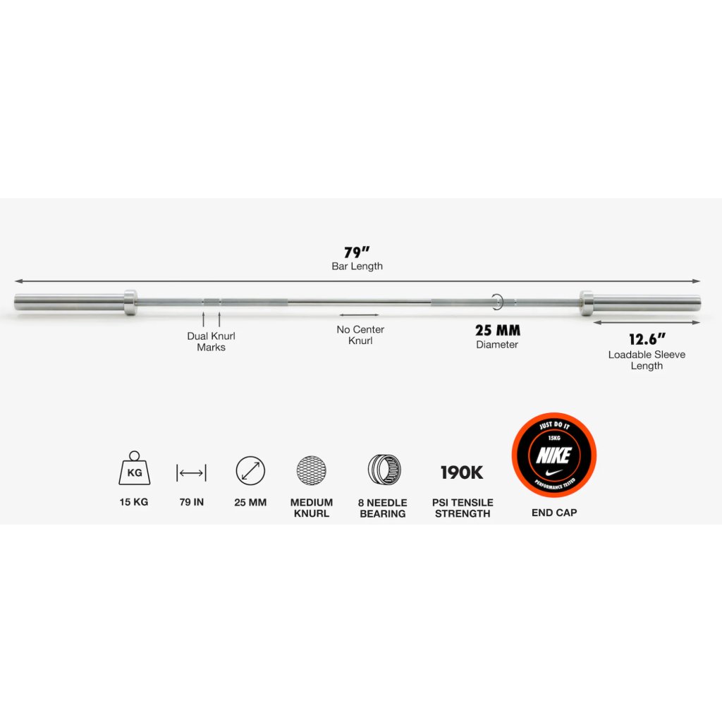 Olympijská osa 15 kg Nike Strength je navržena jako plnohodnotná tréninková osa splňující standardy moderních fitness center. Hmotnost 15 kg a tenčí úchop o průměru 25 mm odpovídají tzv. ženskému olympijskému standardu, který je oblíbený nejen mezi ženami, ale i v technickém vzpírání, cross tréninku a funkčních trénincích.