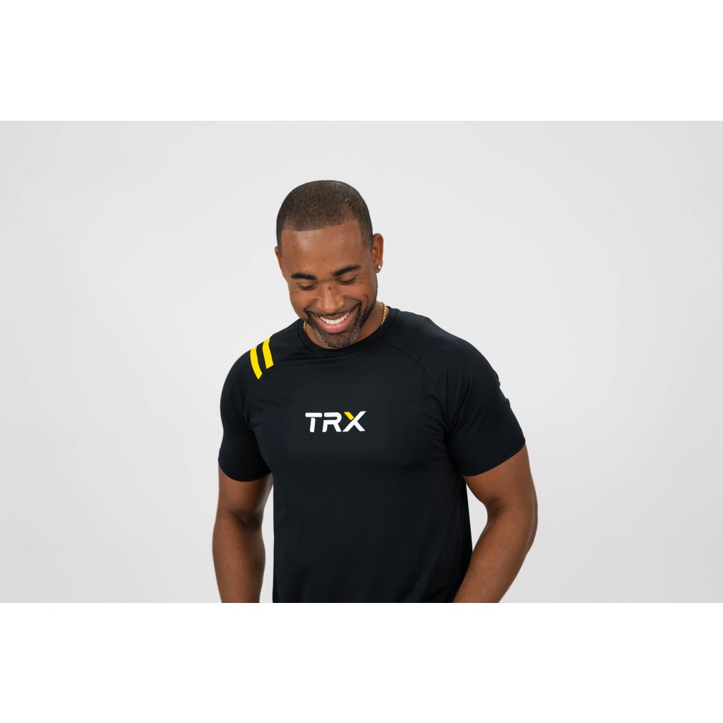 Triko má decentní matné silikonové detaily – logo TRX na hrudi a pruh s ikonickou žlutou barvou na rameni. Štíhlý střih zvýrazňuje postavu, aniž by omezoval v pohybu. Tepelně natištěný štítek uvnitř trika zajišťuje maximální pohodlí bez podráždění.