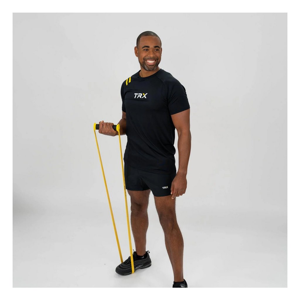 Triko má decentní matné silikonové detaily – logo TRX na hrudi a pruh s ikonickou žlutou barvou na rameni. Štíhlý střih zvýrazňuje postavu, aniž by omezoval v pohybu. Tepelně natištěný štítek uvnitř trika zajišťuje maximální pohodlí bez podráždění.