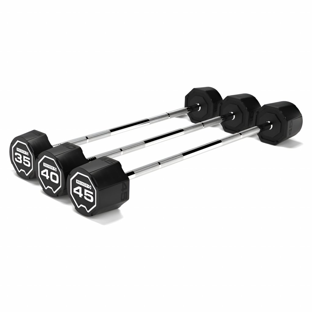 TVAR: Okraje činky jsou oválné a směrem k rukojeti přecházejí do tvaru osmiúhelníku, tím se při odložení nekutálejí, ale drží na místě. Na rozdíl od ostatních nakládacích obouručních činek jsou zde váhy pevně dané.
